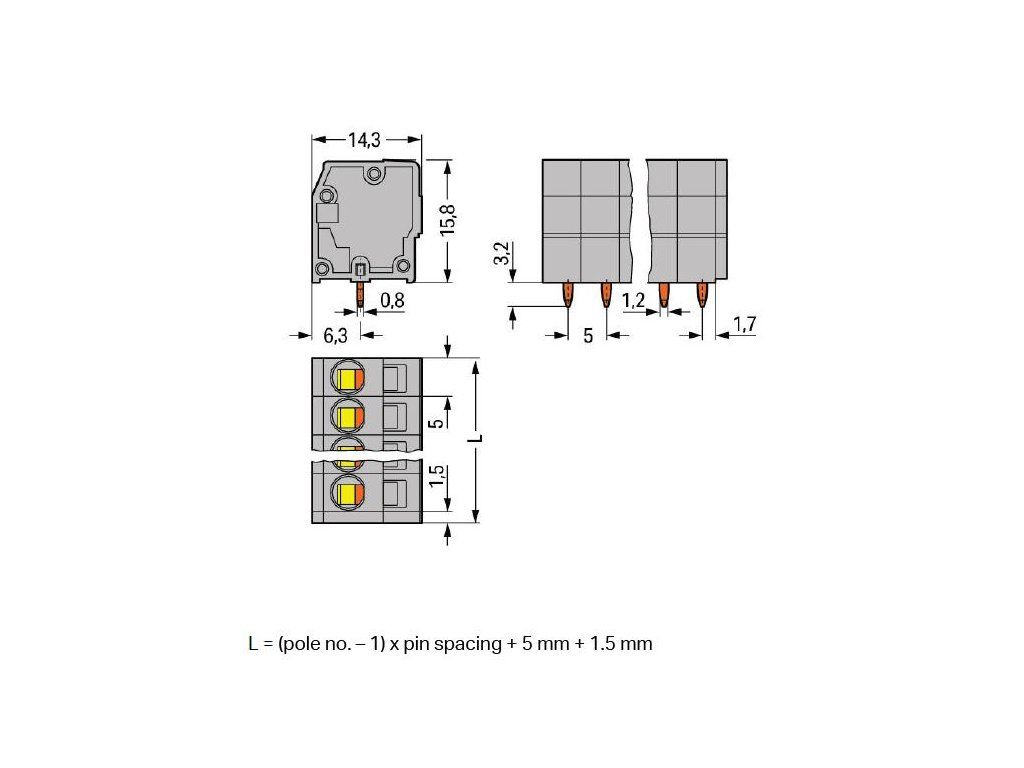 Kompaktní provedení umožňuje použití v zařízeních s omezeným prostorem. Svorka je vhodná pro připojení vodičů v řídicích systémech, průmyslové automatizaci, napájecích modulech a dalších elektronických aplikacích. Konstrukce odpovídá požadavkům moderní elektroniky na bezpečnost, jednoduchost montáže a vysokou kvalitu spojení.