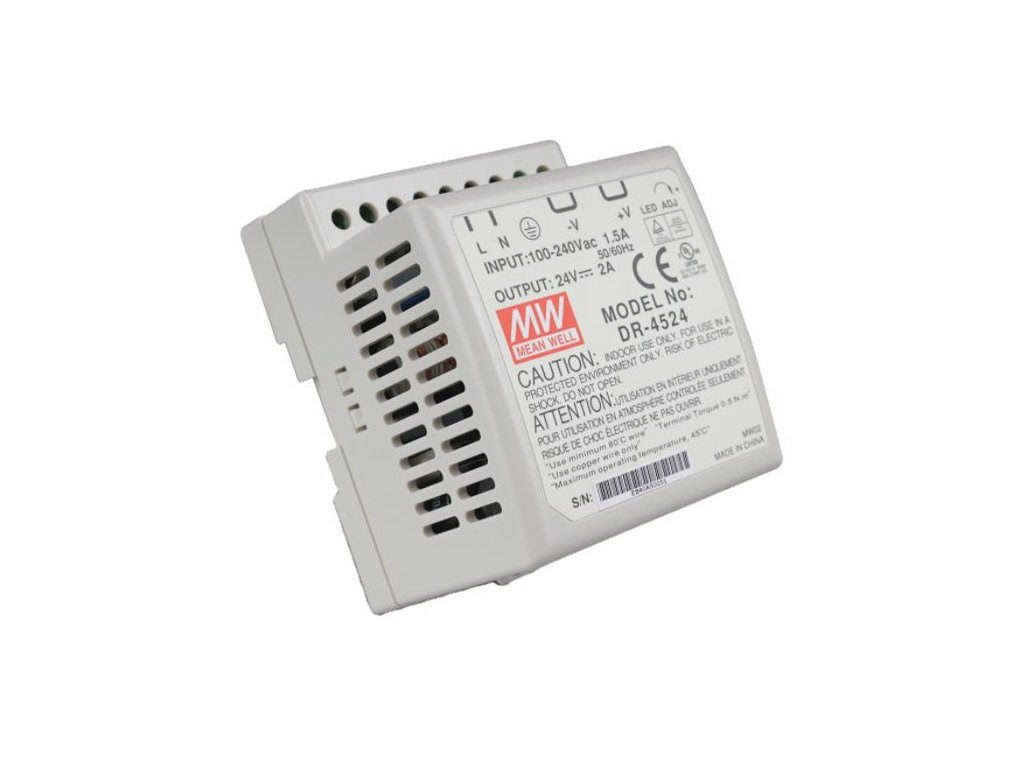 Mean Well DR-4524 je napájecí zdroj určený pro montáž na DIN lištu v rozvaděčích a průmyslových instalacích. Patří do řady DR-45 a poskytuje stabilizované stejnosměrné napětí 24 V s jmenovitým proudem 2 A, tedy výkon 48 W. Výstupní napětí je možné nastavit v rozsahu 21,6 až 26,4 V. Zdroj je navržen pro široký rozsah vstupního napětí 85–264 V AC (47–63 Hz) a podporuje také napájení 120–370 V DC.
