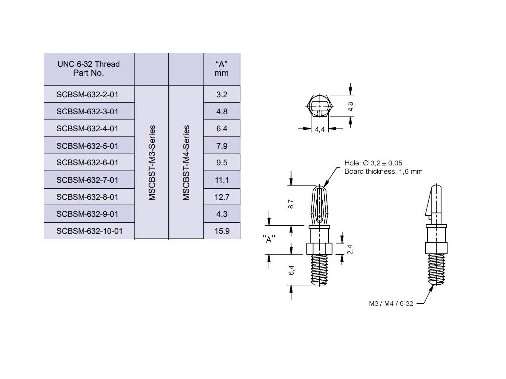 MSCBSM-M3-10-01 (Richco / Essentra Components) je samojistící distanční sloupek pro mechanické uchycení desky plošných spojů na panel nebo nosnou desku. Spodní část tvoří upevnění vnějším závitem M3, které se fixuje maticí na panelu, zatímco horní část je bajonetová špička se zámečkem pro uchycení PCB. Pro osazení je specifikován otvor A o průměru 3,2 mm a tělo sloupku má průměr 4,4 mm. Délka rozpěrky je 15,9 mm a délka závitu 6,4 mm, což umožňuje definované distancování a jistotu montáže. Materiálem je polyamid 66 s třídou hořlavosti UL94 V-2, vhodný pro běžné průmyslové sestavy a rozvaděčové aplikace, kde se vyžaduje pevné mechanické uchycení bez použití kovových rozpěrek.