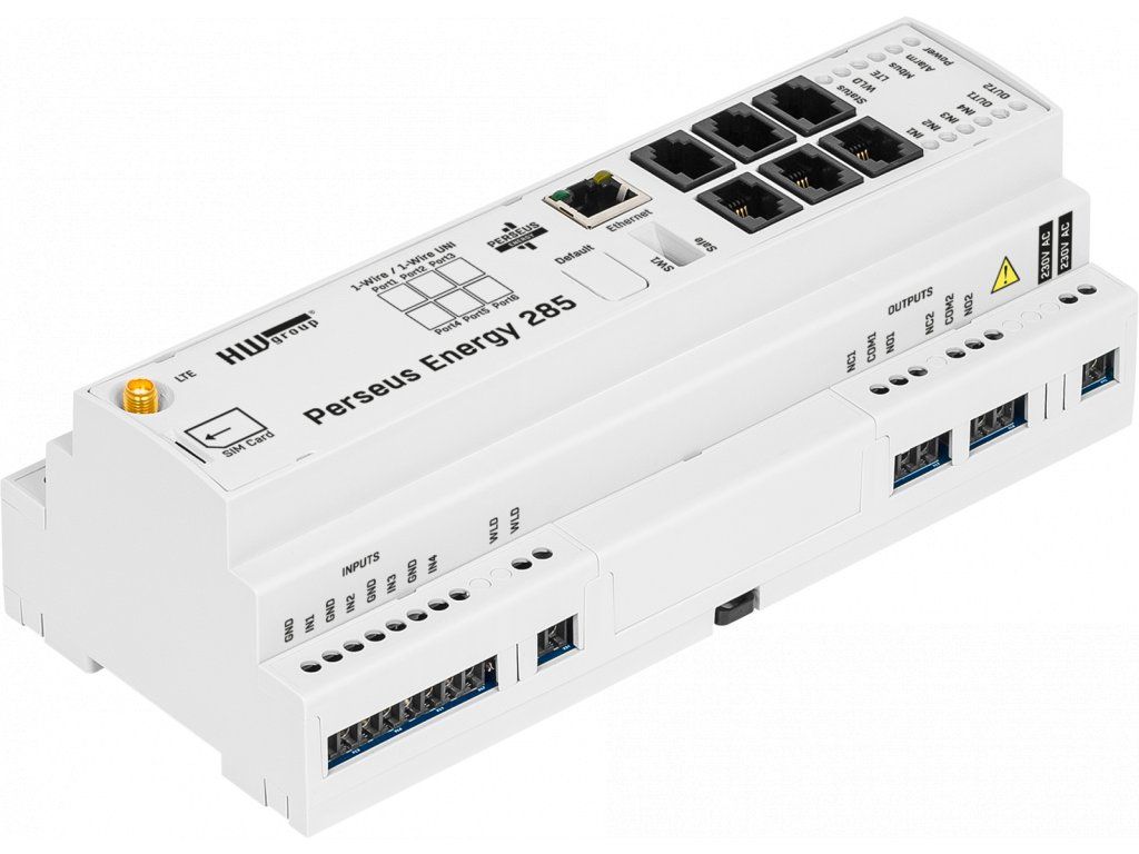 Perseus Energy 285 je monitorovací jednotka HW group určená pro připojení senzorů a měřidel třetích stran přes rozhraní RS-485 s protokolem Modbus/RTU. Zařízení umožňuje sběr dat z externích zařízení a jejich přenos do dohledových systémů přes ethernet nebo mobilní síť LTE. Jednotka podporuje otevřené protokoly SNMP, XML, Modbus/TCP a MQTT pro integraci do SCADA a NMS systémů. Lze ji použít jako bránu z Modbus/RTU na IP protokoly. Díky LTE konektivitě je vhodná pro instalace bez dostupné LAN infrastruktury.